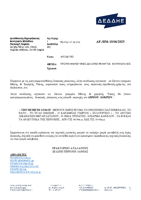 Υποβλήθηκε Τρ, 10/06/2025 - 02:56 Προγραμματισμένες διακοπές ρεύματος