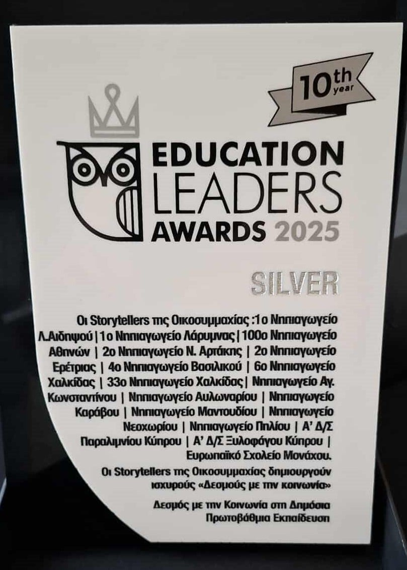 ΑΣΗΜΕΝΙΟ ΒΡΑΒΕΙΟ για την ΟΙΚΟΣΥΜΜΑΧΙΑ στα Education Leaders Awards 2025 στην κατηγορία “Δεσμός με την Κοινωνία”! Μια δυναμική εκπαιδευτική σύμπραξη 17 σχολείων από Ελλάδα, Κύπρο & Μόναχο — ανάμεσά τους και το 1ο Νηπιαγωγείο Λάρυμνας— που από το 2019 ενώνει εκπαιδευτικούς, μαθητές, γονείς & φορείς γύρω από ένα κοινό όραμα: Την οικολογική και κοινωνική ευαισθητοποίηση, τη συμμετοχή της κοινότητας στην εκπαιδευτική διαδικασία και την ανάπτυξη δεξιοτήτων του 21ου αιώνα, μέσα από τη φιλαναγνωσία, τη δημιουργική αφήγηση και το eTwinning.