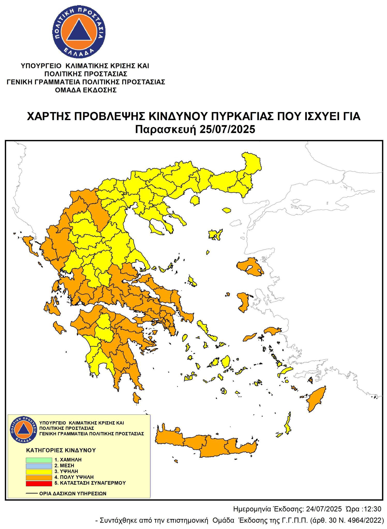 Υποβλήθηκε Πε, 24/07/2025 - 02:28 Χάρτης Πρόβλεψης Κινδύνου Πυρκαγιάς για Παρασκευή 25-07-2025