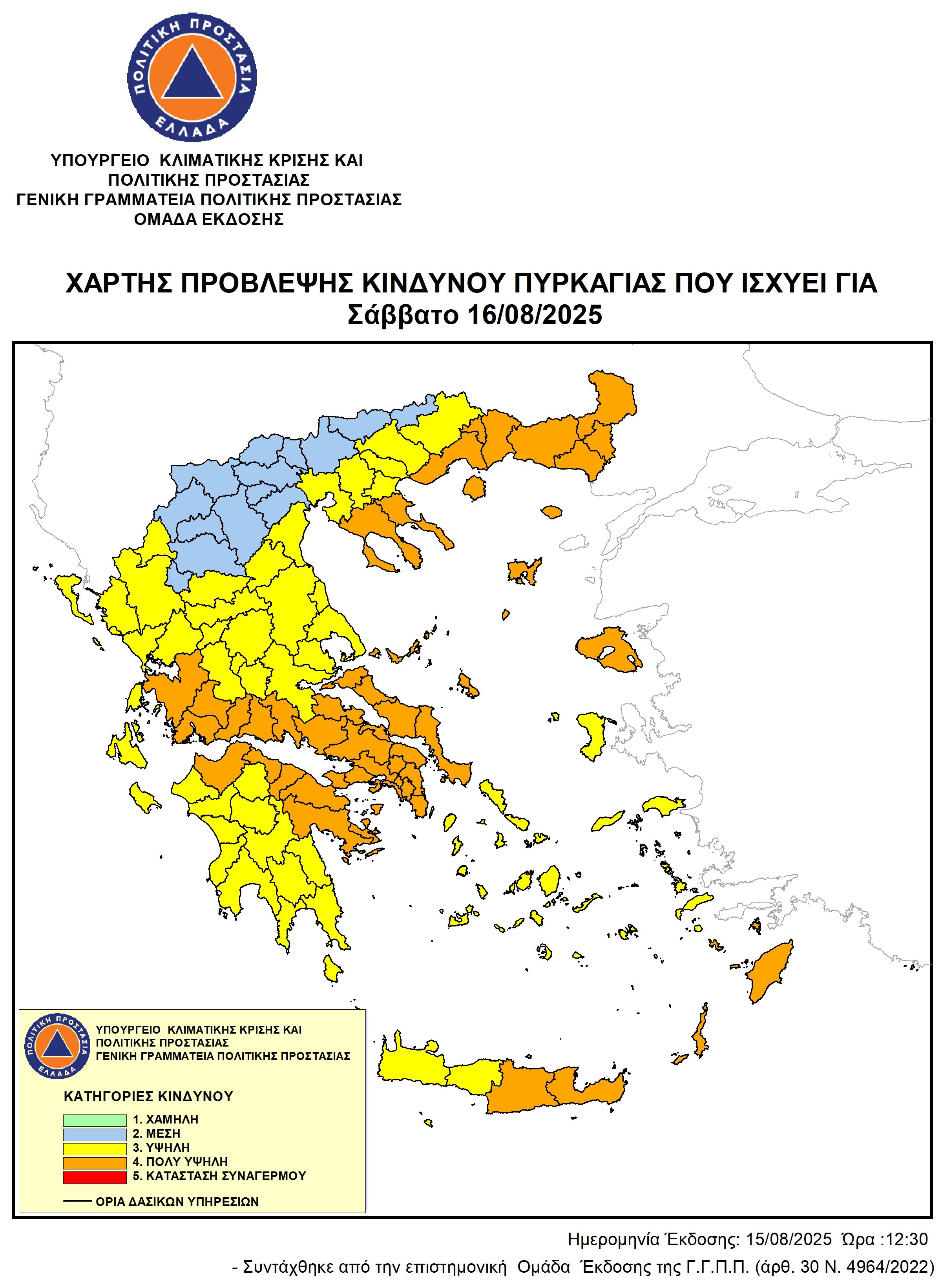 Υποβλήθηκε Σα, 16/08/2025 - 12:15 Χάρτης Πρόβλεψης Κινδύνου Πυρκαγιάς για Σάββατο 16-08-2025