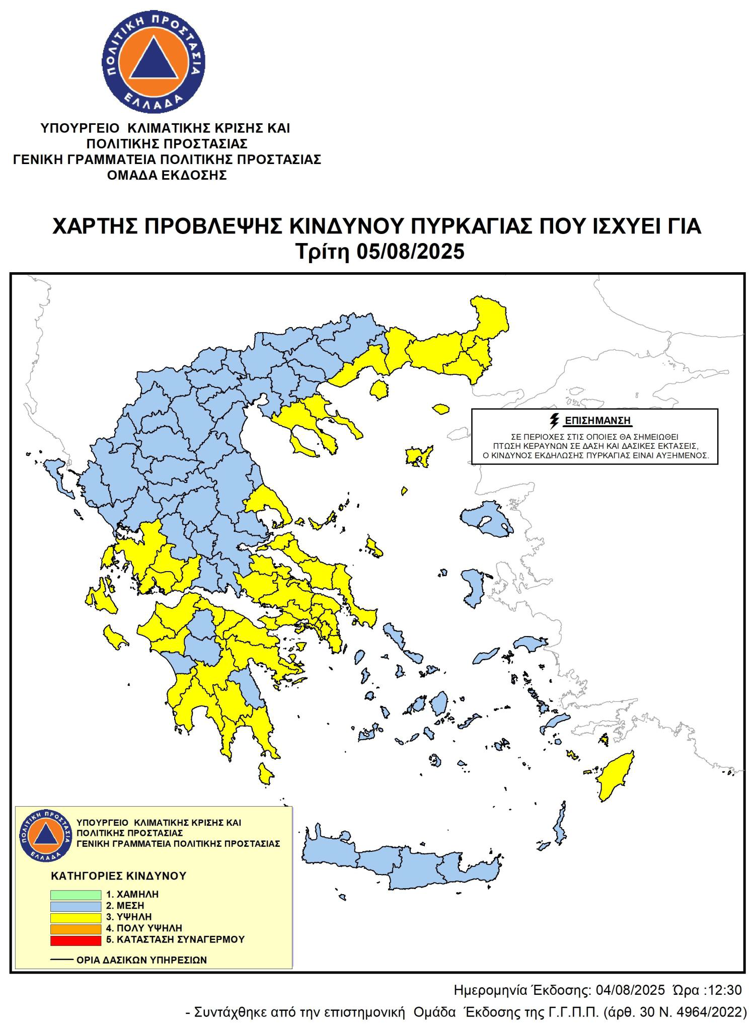 Υποβλήθηκε Τρ, 05/08/2025 - 07:33 Χάρτης Πρόβλεψης Κινδύνου Πυρκαγιάς για τη Τρίτη 05-08-2025
