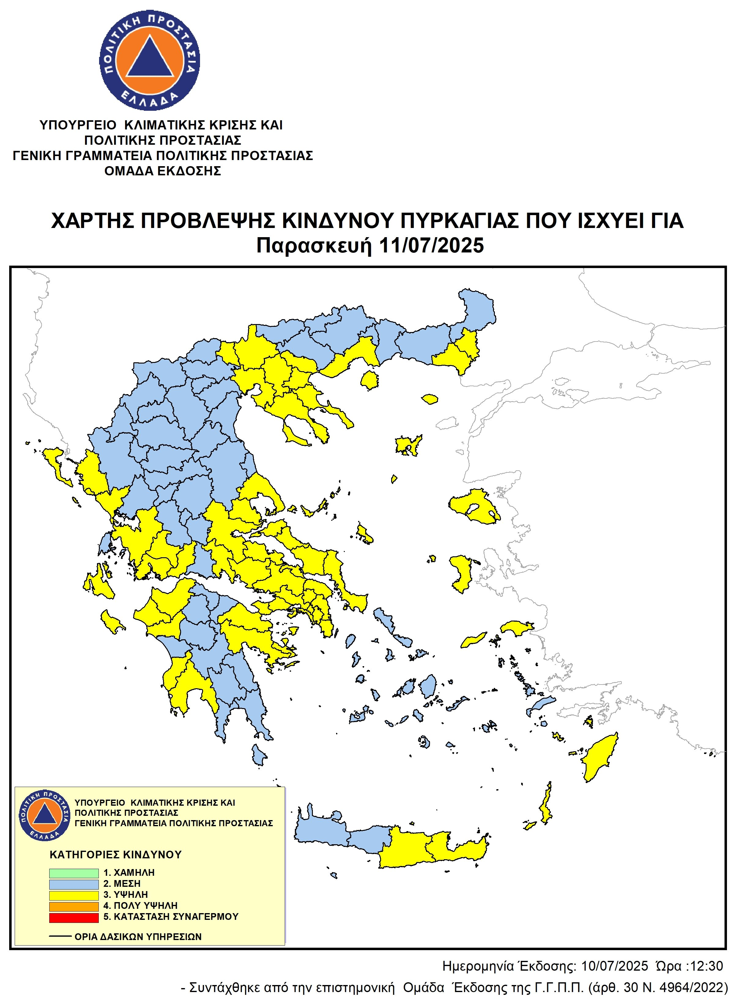 Υποβλήθηκε Πε, 10/07/2025 - 02:51 Χάρτης Πρόβλεψης Κινδύνου Πυρκαγιάς για την Παρασκευή 11-07-2025