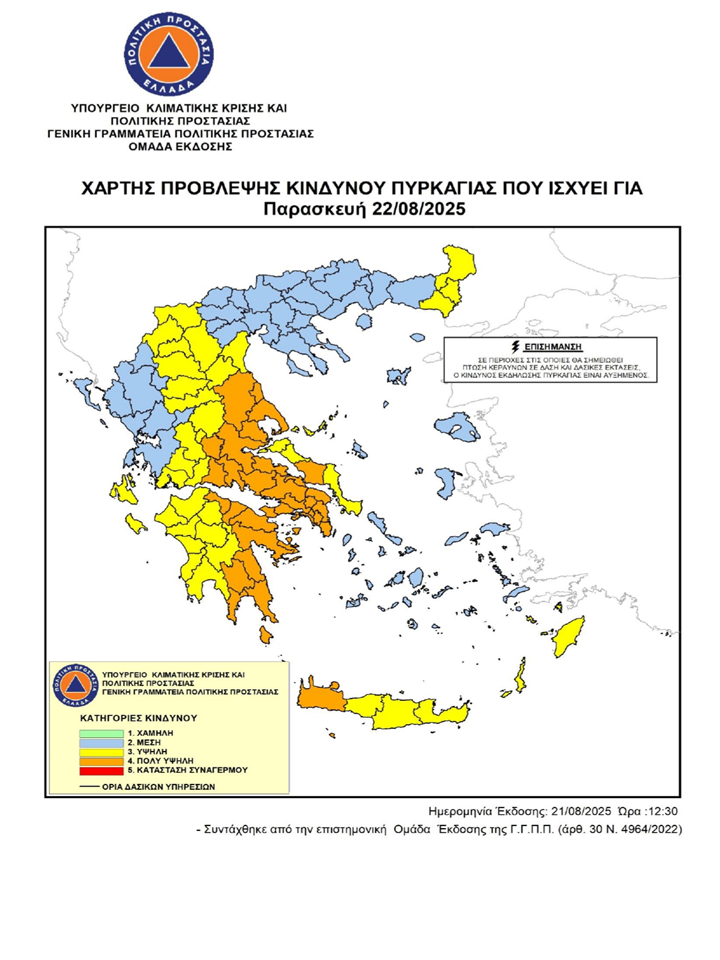 Χάρτης Πρόβλεψης Κινδύνου Πυρκαγιάς για την Παρασκευή 22-08-2025