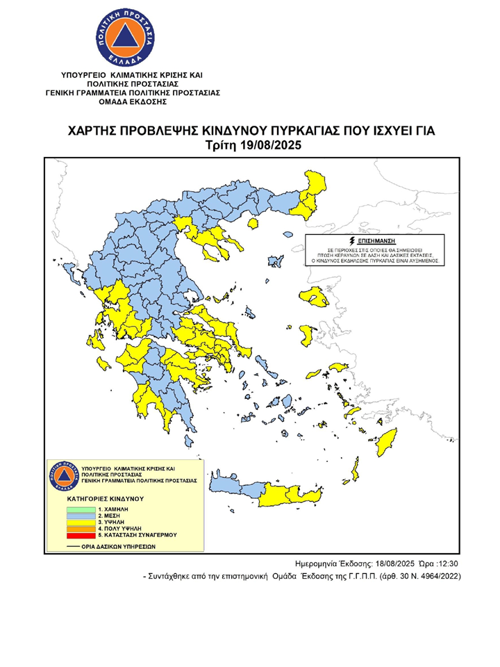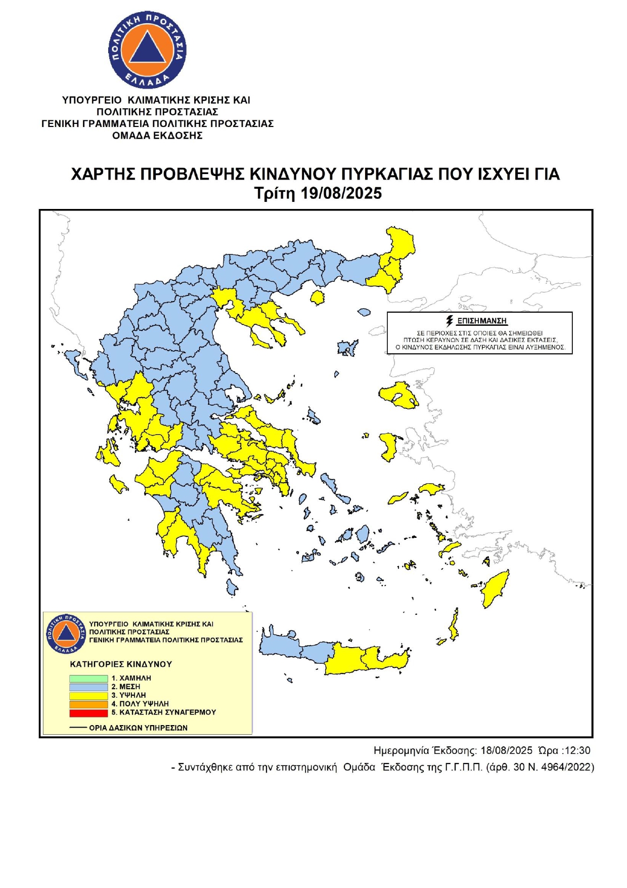 Υποβλήθηκε Δε, 18/08/2025 - 02:16 Χάρτης Πρόβλεψης Κινδύνου Πυρκαγιάς για Τρίτη 19-08-2025