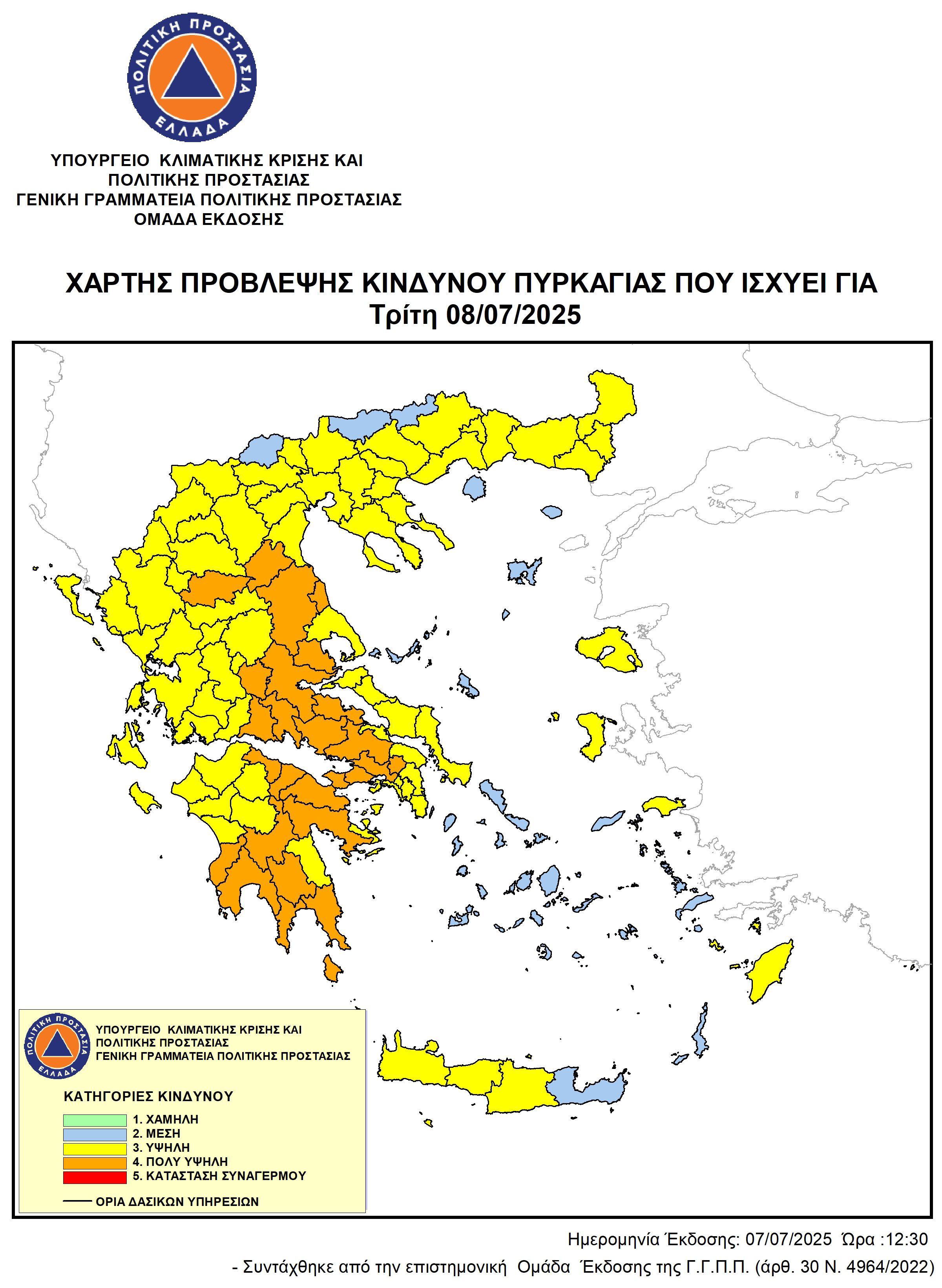 Υποβλήθηκε Δε, 07/07/2025 - 02:44 Χάρτης Πρόβλεψης Κινδύνου Πυρκαγιάς – Ιδιαίτερο προειδοποιητικό σήμα – Λήψη μέτρων λόγω υψηλής επικινδυνότητας εκδήλωσης και εξάπλωσης δασικών πυρκαγιών