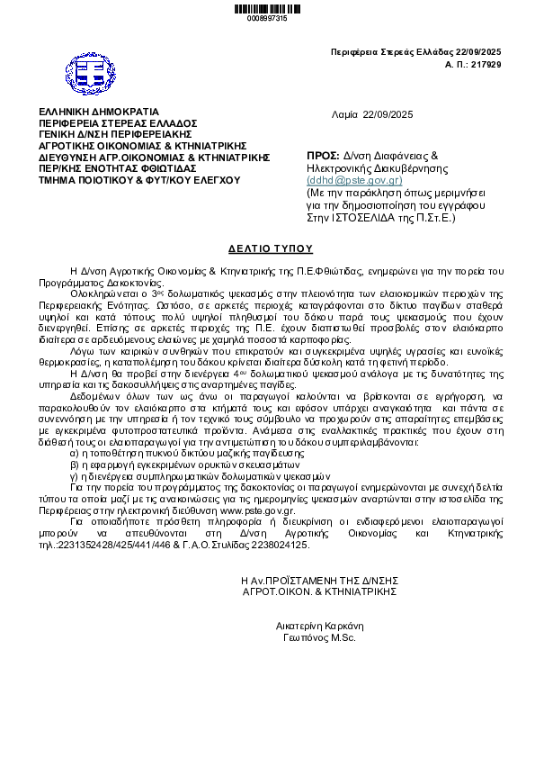 Υποβλήθηκε Τρ, 23/09/2025 - 11:53 Δελτίο τύπου – Πορεία Προγράμματος Δακοκτονίας 2025
