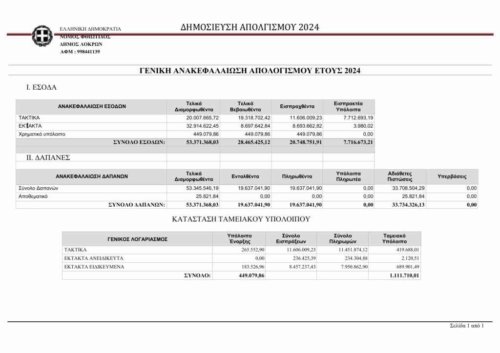 Ο Δήμαρχος Λοκρών ανακοινώνει ότι σύμφωνα με την 34/420/2025 απόφασης της Δημοτικής Επιτροπής με ΑΔΑ: 9ΗΣΦΩΛΤ-ΞΣΡ εγκρίθηκε ο Οικονομικός απολογισμός εσόδων-εξόδων έτους 2024 Δήμου Λοκρών ο οποίος συνοπτικά έχει ως εξής: