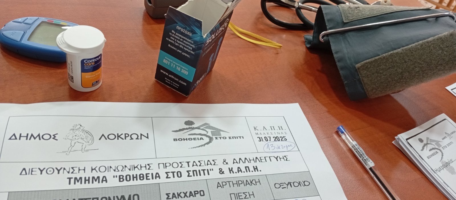 Ο Δήμος Λοκρών μέσω τη Διεύθυνσης Κοινωνικής Προστασίας και Αλληλεγγύης και το Βοήθεια στο Σπίτι αναδεικνύοντας την ανάγκη προληπτικού ελέγχου υγείας των δημοτών, διοργάνωσε δράση μέτρησης ζωτικών σημείων (πίεσης, σακχάρου, οξυγόνου), στους χώρους των ιατρείων των ΚΑΠΗ Αταλάντης στις 25-07-2025 και ΚΑΠΗ Μαλεσίνας στις 31-07-2025, τις ώρες 09:00 π.μ-11:00 π.μ.