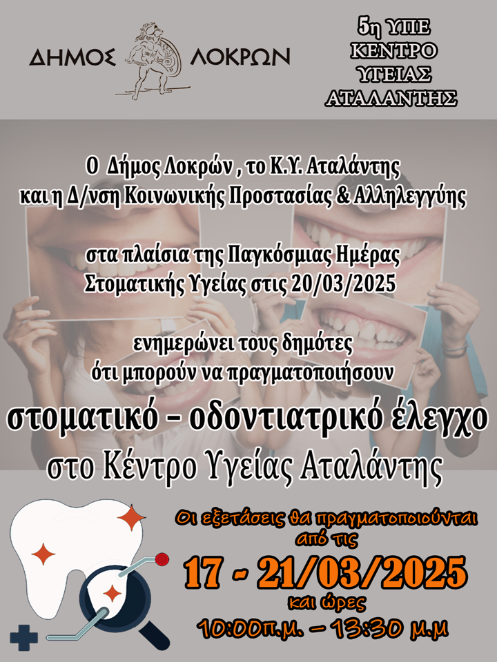 Υποβλήθηκε Δε, 10/03/2025 - 02:38 Δράση του Δήμου Λοκρών και του ΚΥΑ στα πλαίσια της Παγκόσμια Ημέρας Στοματικής Υγείας από τις 17 έως τις 21 Μαρτίου 2025