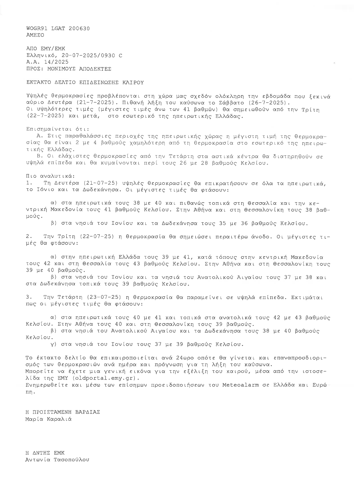 Έκτακτο Δελτίο Επιδείνωσης καιρού Α.Α. 14/2025
