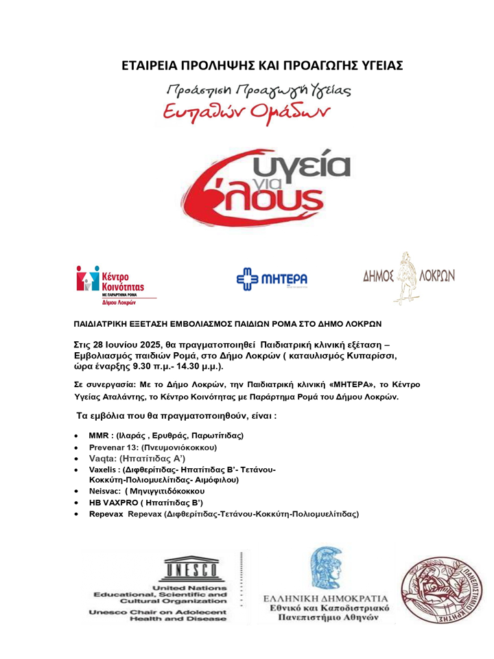 Υποβλήθηκε Πε, 26/06/2025 - 03:25 Εμβολιασμοί σε παιδιά Ρομά των καταυλισμών του Δήμου Λοκρών το Σάββατο 28 Ιουνίου 2025
