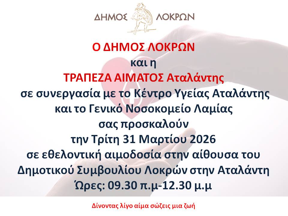 Υποβλήθηκε Πε, 05/03/2026 - 09:43 Εθελοντική Αιμοδοσία στην Αταλάντη Δήμου Λοκρών την Τρίτη 31 Μαρτίου 2026