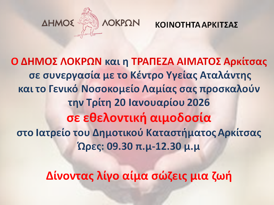 Υποβλήθηκε Πε, 15/01/2026 - 01:25 Εθελοντική Αιμοδοσία στην Κοινότητα της Αρκίτσας την Τρίτη 20 Ιανουαρίου 2026