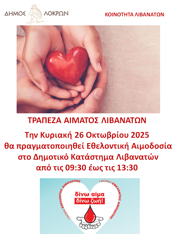 Υποβλήθηκε Πα, 17/10/2025 - 09:54 Εθελοντική αιμοδοσία στο Δημοτικό Κατάστημα Λιβανατών την Κυριακή 26 Οκτωβρίου 2025