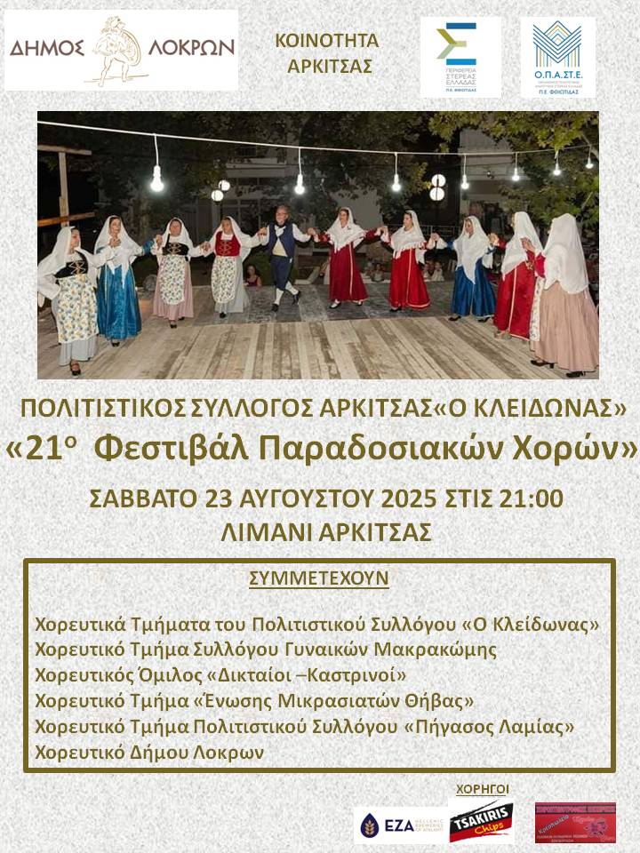 Υποβλήθηκε Τρ, 19/08/2025 - 09:40 “21ο Φεστιβάλ Παραδοσιακών Χορών” στο λιμάνι Αρκίτσας το Σάββατο 23 Αυγούστου 2025 στις 21:00