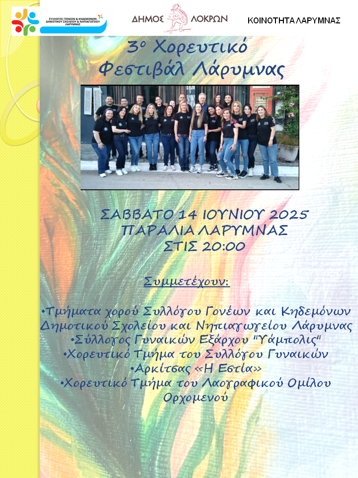 Υποβλήθηκε Πε, 05/06/2025 - 12:23 3o Χορευτικό Φεστιβάλ Λάρυμνας το Σάββατο 14 Ιουνίου 2025 στην παραλία Λάρυμνας Δήμου Λοκρών