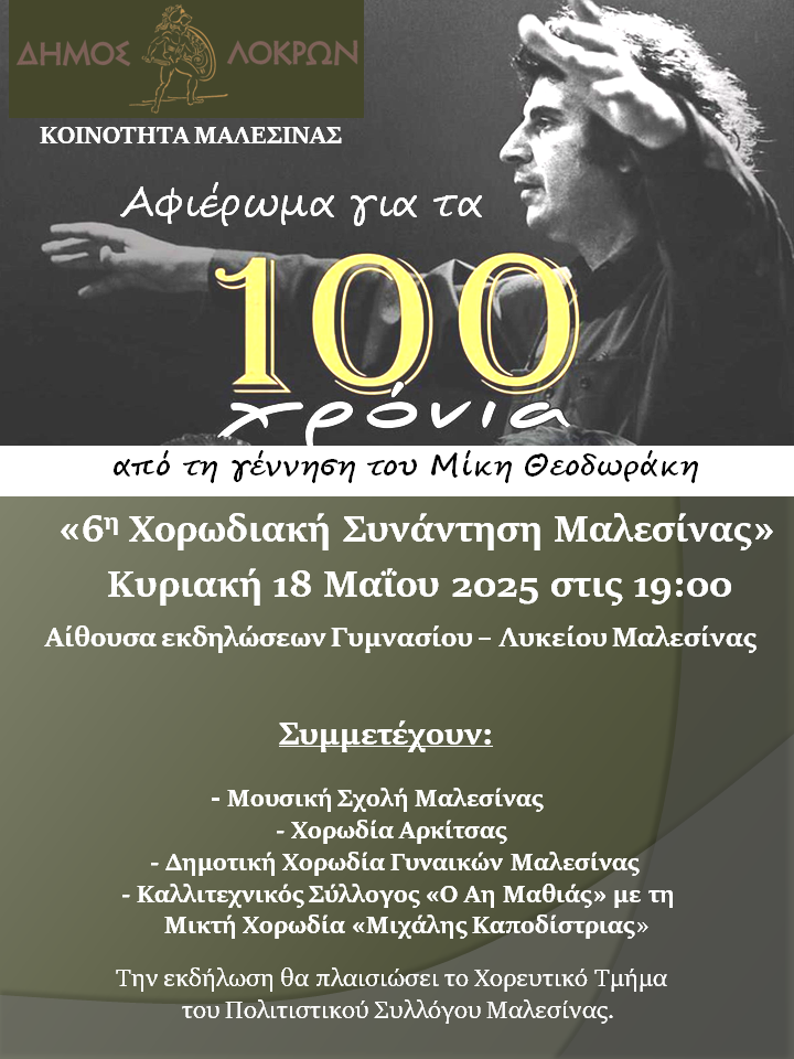 “6η Χορωδιακή Συνάντηση Μαλεσίνας” αφιερωμένη στα 100 χρόνια από τη γέννηση του Μίκη Θεοδωράκη την Κυριακή 18 Μαΐου 2025