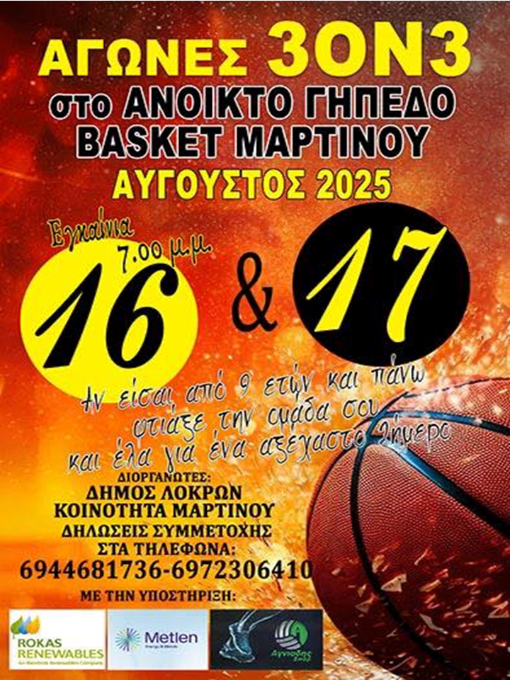 Εγκαίνια και αγώνες 3on3 στο Ανοιχτό Γήπεδο Μπάσκετ Μαρτίνου στις 16 και 17 Αυγούστου 2025 στις 19:00