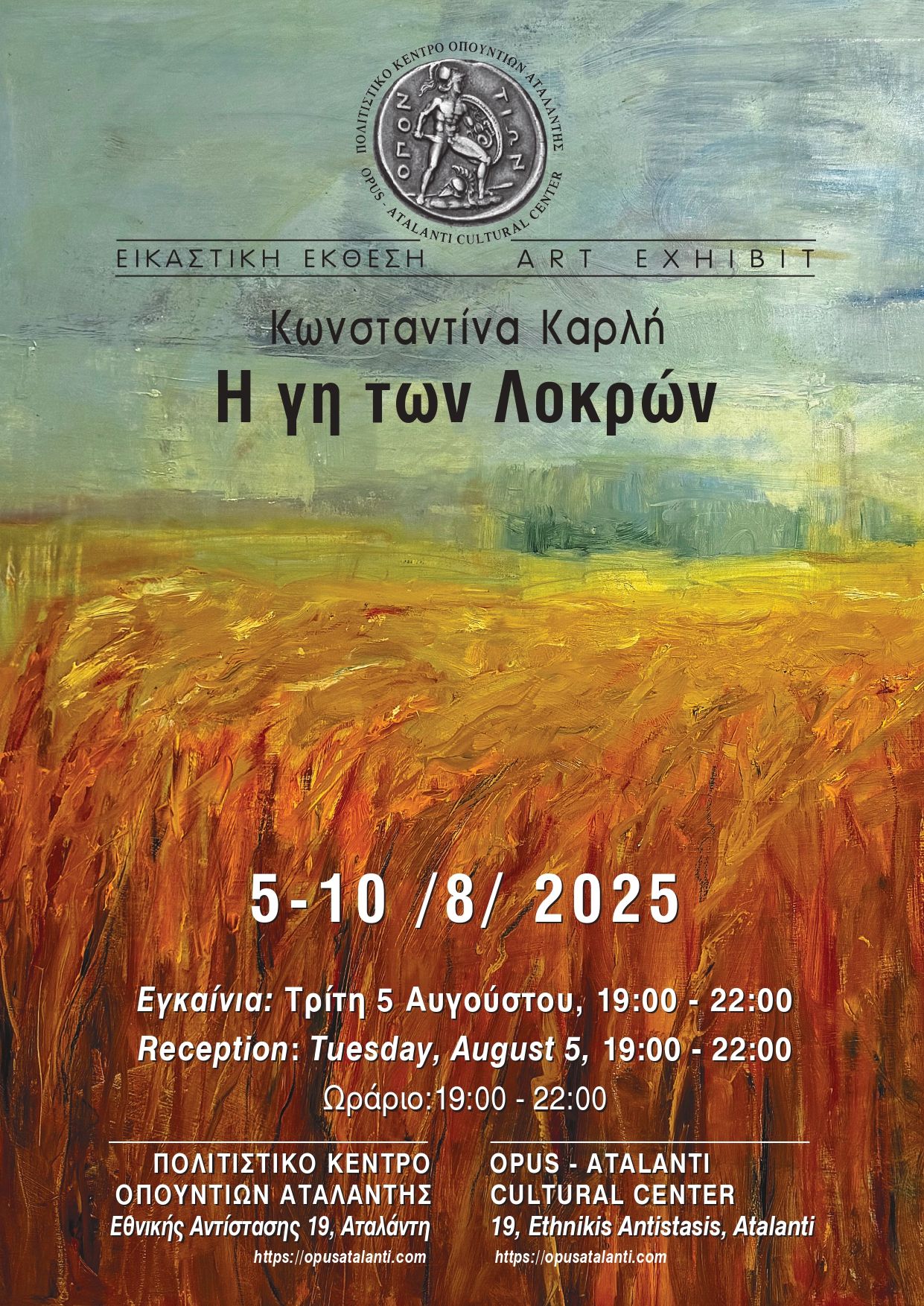 Υποβλήθηκε Τε, 16/07/2025 - 09:53 Εικαστική Έκθεση της Κωνσταντίνας Καρλή “Η γη των Λοκρών” στο Πολιτιστικό Κέντρο Οπουντίων Αταλάντης