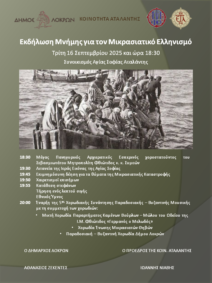 Εκδήλωση Μνήμης για τον Μικρασιατικό Ελληνισμό την Τρίτη 16 Σεπτεμβρίου 2025 στις 18:30 στον Ιερό Ναό Αγίας Σοφίας Αταλάντης