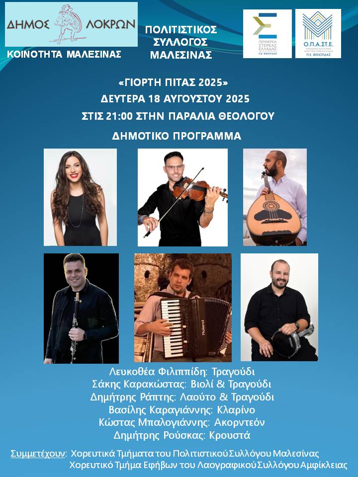 Υποβλήθηκε Δε, 11/08/2025 - 03:03 Ετήσια “Γιορτή Πίτας” στην παραλία Θεολόγου Δήμου Λοκρών τη Δευτέρα 18 Αυγούστου 2025 στις 21:00
