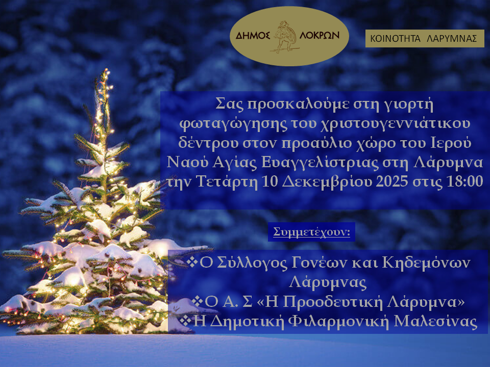 Φωταγώγηση Χριστουγεννιάτικου Δέντρου στη Λάρυμνα Δήμου Λοκρών την Τετάρτη 10 Δεκεμβρίου 2025 στις 18:00