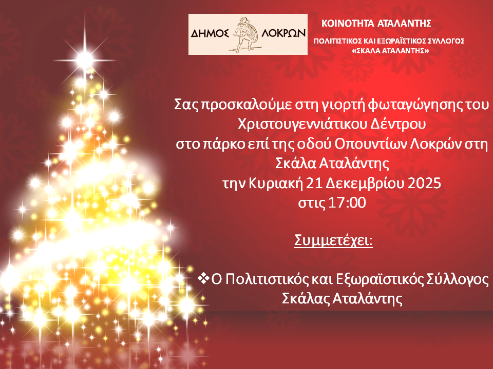 Φωταγώγηση Χριστουγεννιάτικου Δέντρου στη Σκάλα Αταλάντης Δήμου Λοκρών την Κυριακή 21 Δεκεμβρίου 2025 στις 17:00