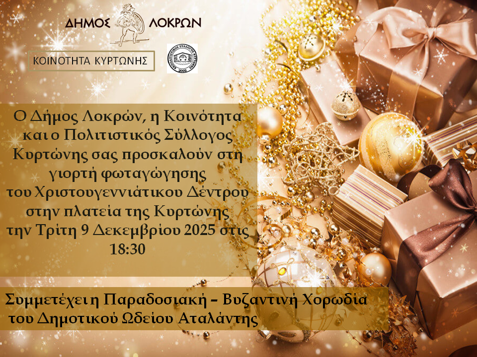 Ημερομηνία Έναρξης: 9/12/2025 Ημερομηνία Λήξης: 9/12/2025 Ώρα Έναρξης: 18:30 Τοποθεσία Εκδήλωσης: Πλατεία Κυρτώνης Δήμου Λοκρών