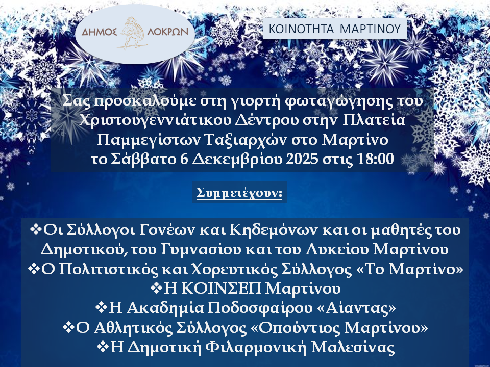 Ημερομηνία Έναρξης: 6/12/2025 Ημερομηνία Λήξης: 6/12/2025 Ώρα Έναρξης: 18:00 Τοποθεσία Εκδήλωσης: Πλατεία Παμμεγίστων Ταξιαρχών Μαρτίνου Δήμου Λοκρών