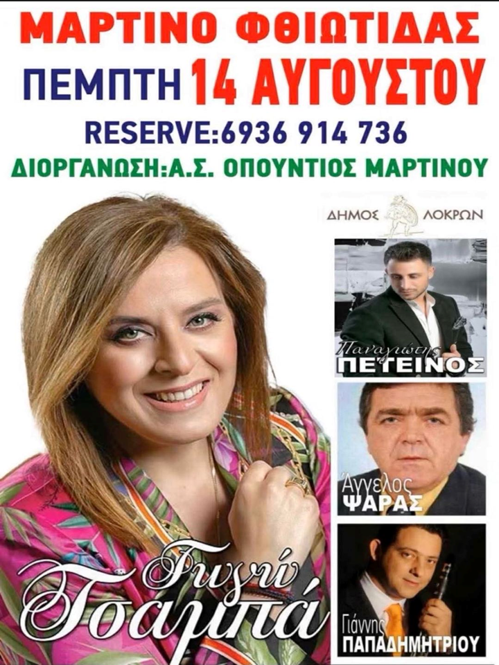 Μουσική εκδήλωση του Α.Σ Οπούντιος Μαρτίνου την Πέμπτη 14 Αυγούστου 2025 στην Πλατεία Βάσσου Μαυροβουνιώτη στο Μαρτίνο Δήμου Λοκρών