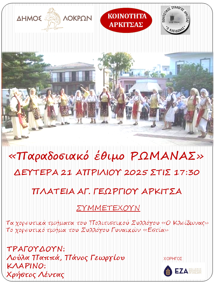 Υποβλήθηκε Πε, 10/04/2025 - 02:55 Παραδοσιακό Έθιμο της “Ρωμάνας” στην Αρκίτσα του Δήμου Λοκρών την Δευτέρα 21 Απριλίου 2025