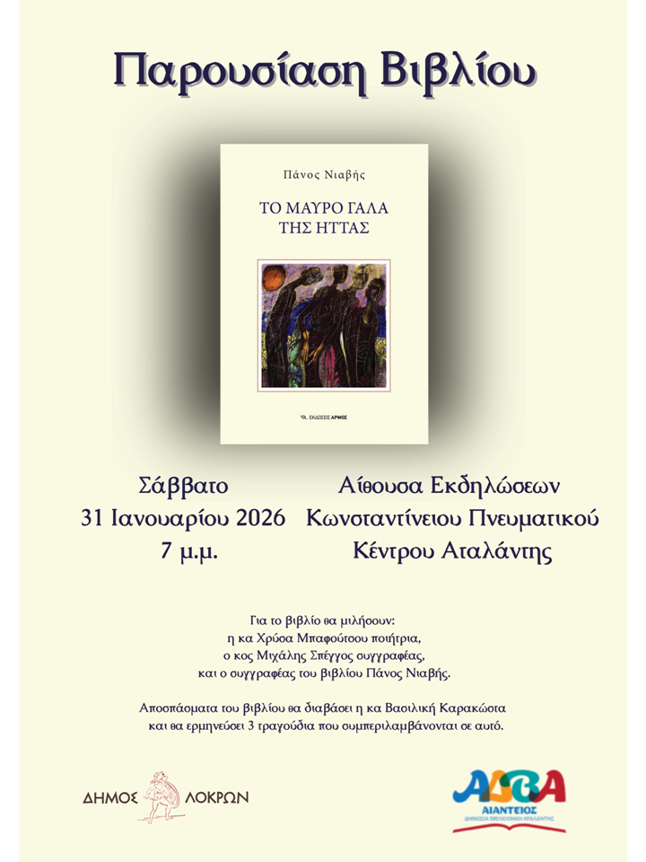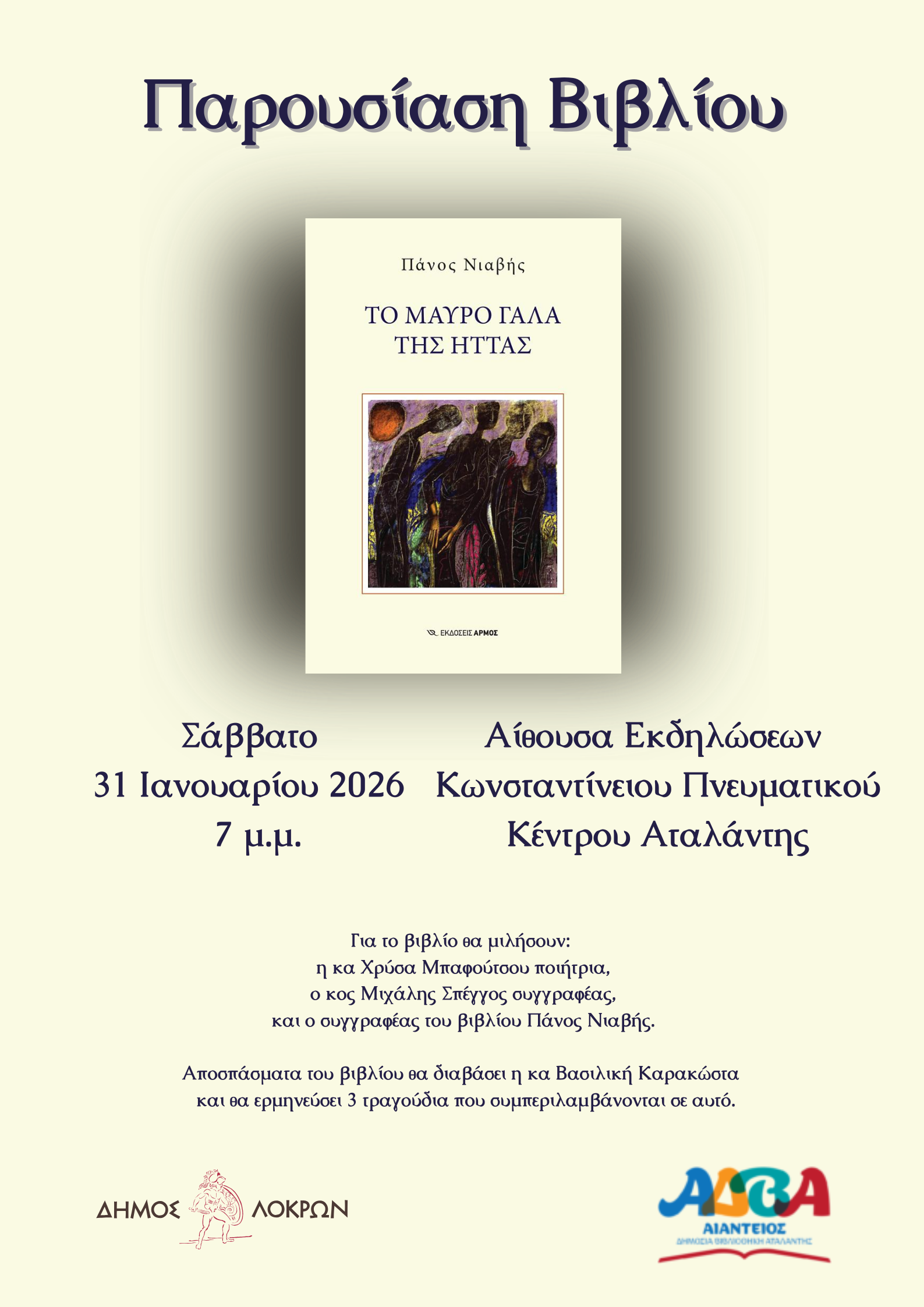 Υποβλήθηκε Πε, 22/01/2026 - 09:40 Παρουσίαση του βιβλίου του Πάνου Νιαβή “Το μαύρο γάλα της ήττας” το Σάββατο 31 Ιανουαρίου 2026 στις 19:00 στο Κωνσταντίνειο Πνευματικό Κέντρο Αταλάντης