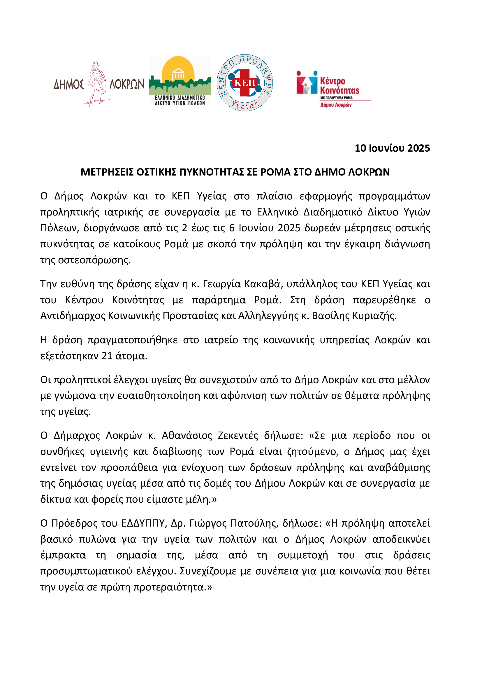 Υποβλήθηκε Τρ, 10/06/2025 - 02:03 Μετρήσεις οστικής πυκνότητας σε Ρομά στο Δήμο Λοκρών