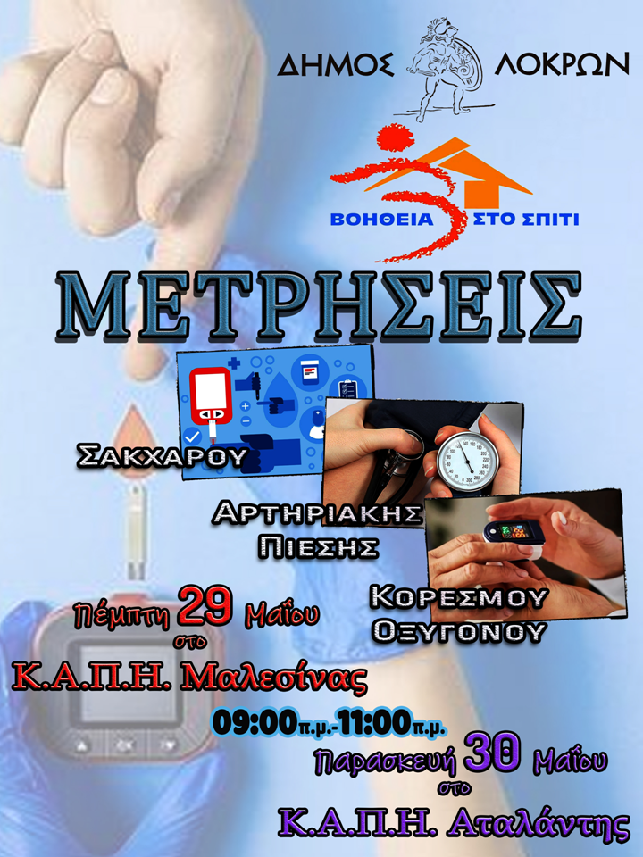 Υποβλήθηκε Πα, 23/05/2025 - 10:30 Μετρήσεις ζωτικών σημείων στα ΚΑΠΗ Δήμου Λοκρών για το μήνα Μάιο
