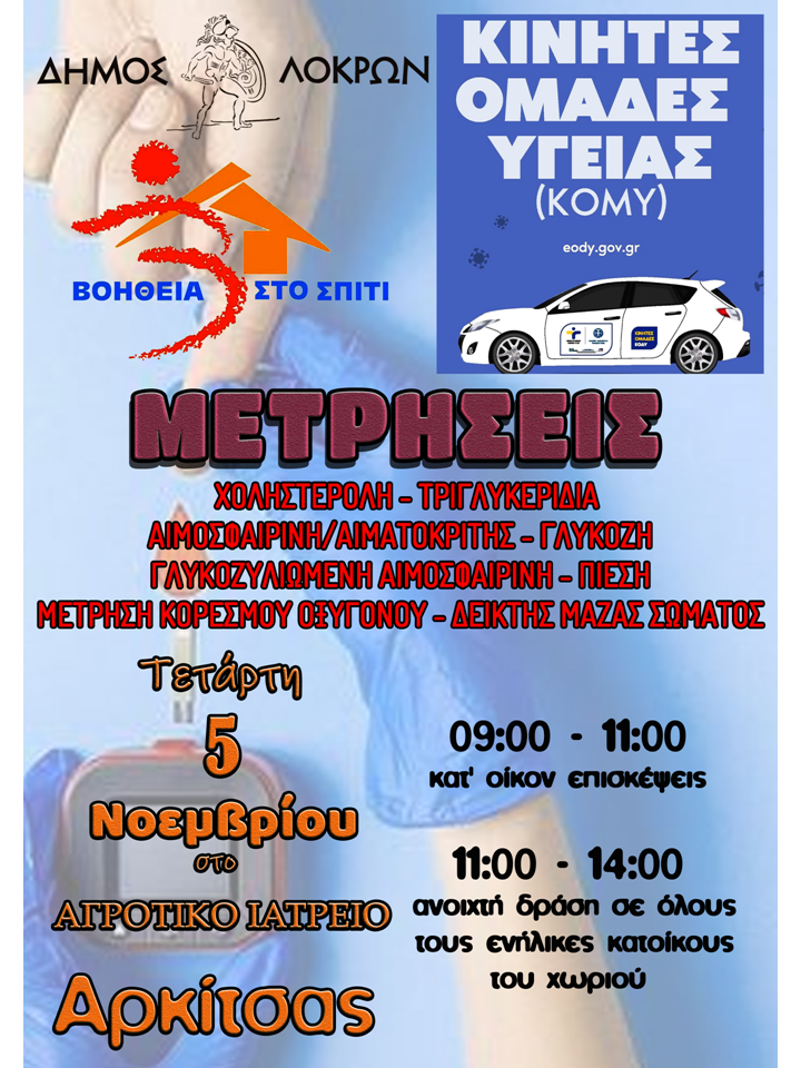 Υποβλήθηκε Δε, 03/11/2025 - 12:52 Μετρήσεις ζωτικών σημείων στο Αγροτικό Ιατρείο Αρκίτσας την Τετάρτη 5 Νοεμβρίου 2025
