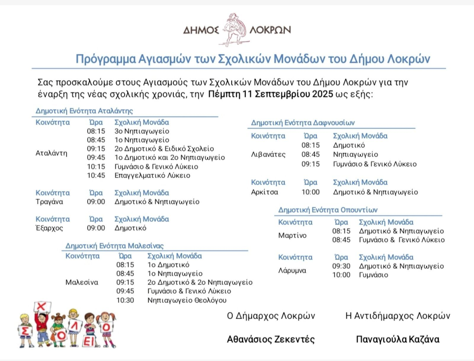 Υποβλήθηκε Τρ, 02/09/2025 - 12:50 Πρόγραμμα Αγιασμών των Σχολικών Μονάδων του Δήμου Λοκρών