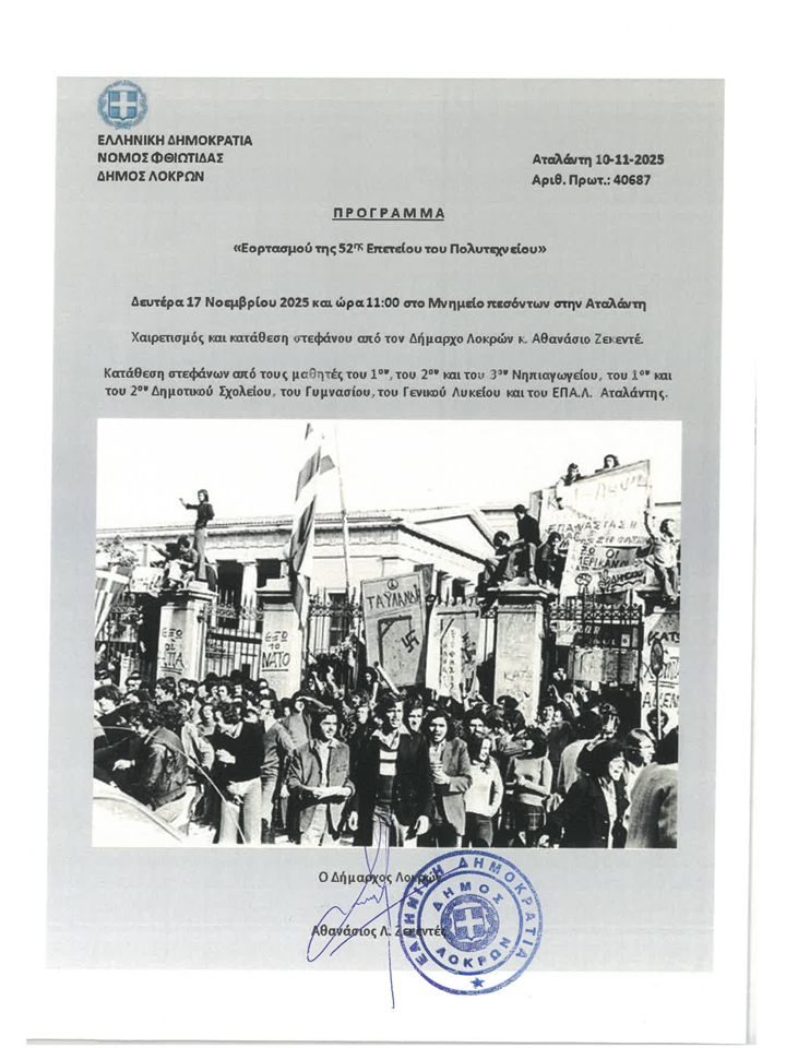 Υποβλήθηκε Δε, 10/11/2025 - 04:54 Πρόγραμμα Εορτασμού της 52ης Επετείου του Πολυτεχνείου στο Δήμο Λοκρών