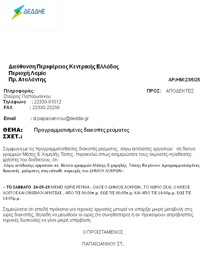 Προγραμματισμένες διακοπές ρεύματος στο Δήμο Λοκρών