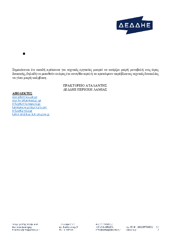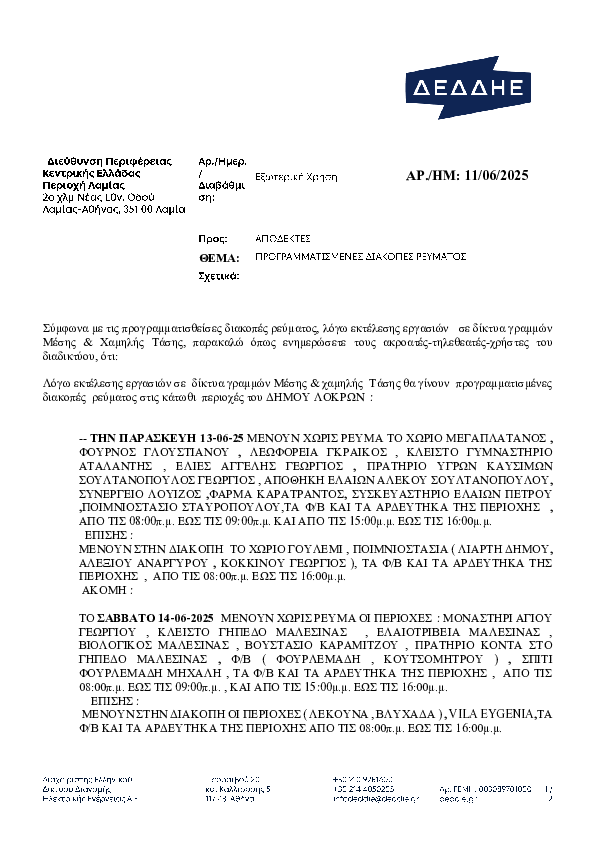 Προγραμματισμένες διακοπές ρεύματος στο Δήμο Λοκρών