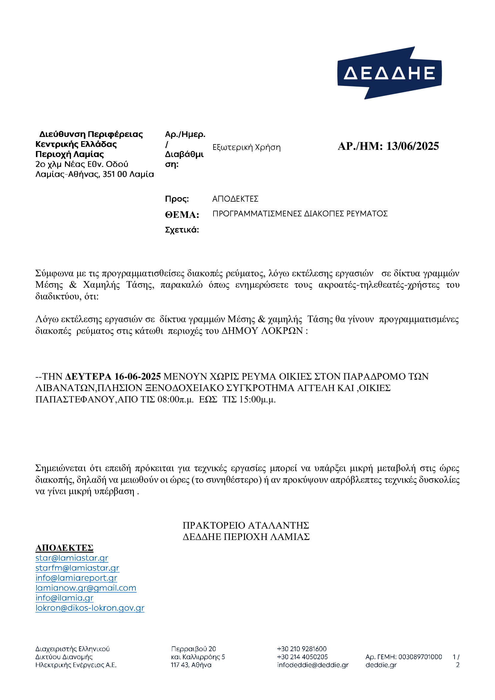 Υποβλήθηκε Πα, 13/06/2025 - 02:36 Προγραμματισμένες διακοπές ρεύματος