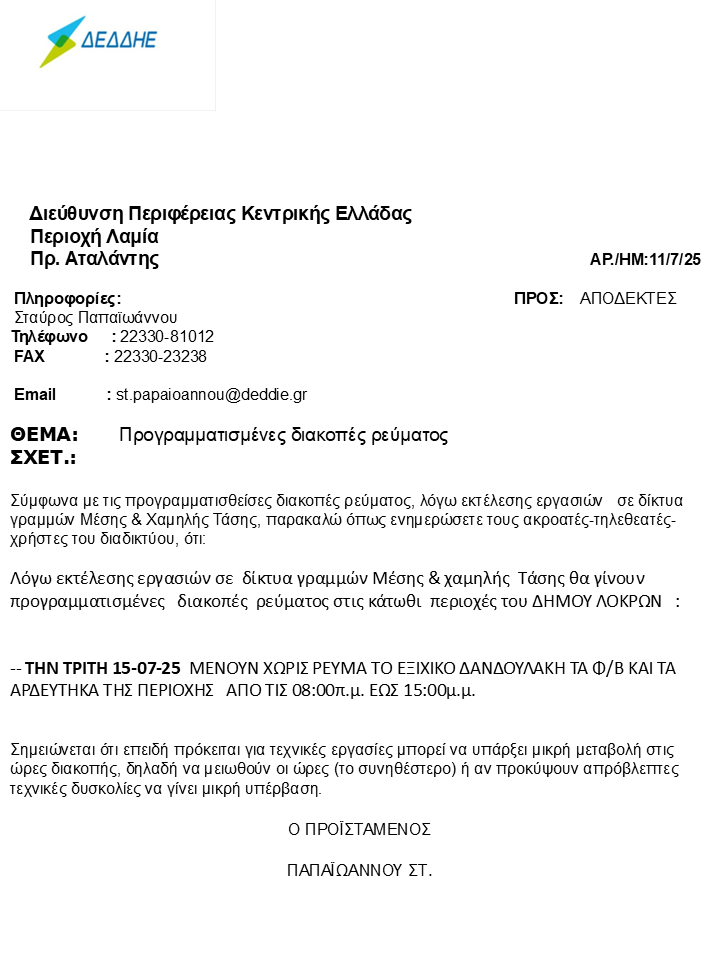 Προγραμματισμένες διακοπές ρεύματος στο Δήμο Λοκρών