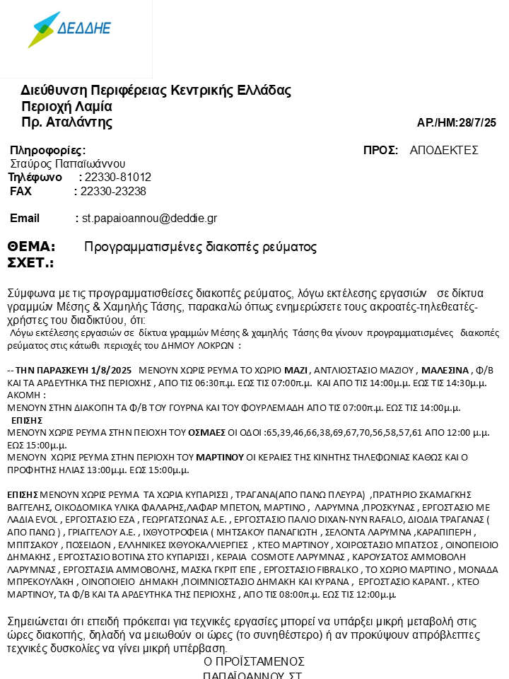 Υποβλήθηκε Δε, 28/07/2025 - 02:34 Προγραμματισμένες διακοπές ρεύματος