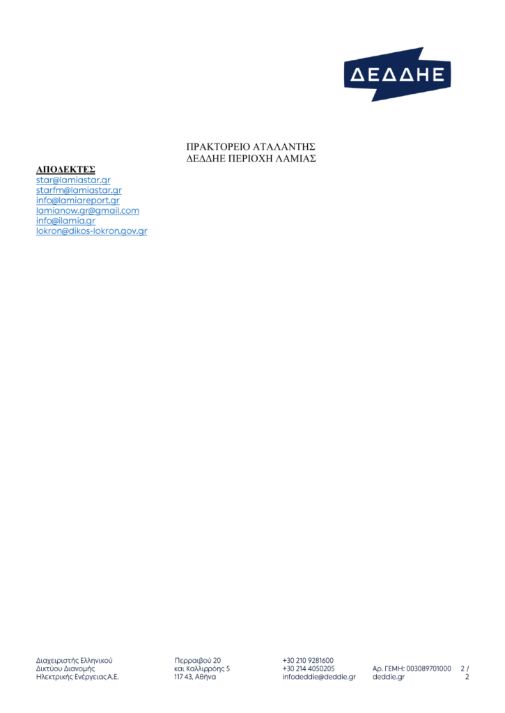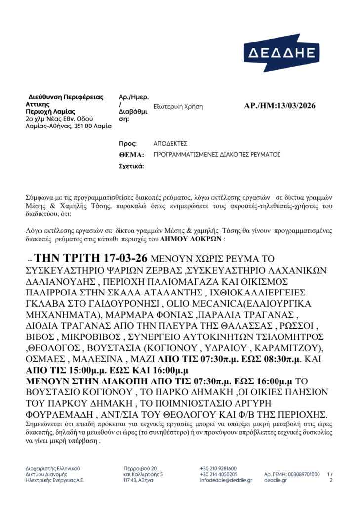 Υποβλήθηκε Πα, 13/03/2026 - 11:04 Προγραμματισμένες Διακοπές Ρεύματος