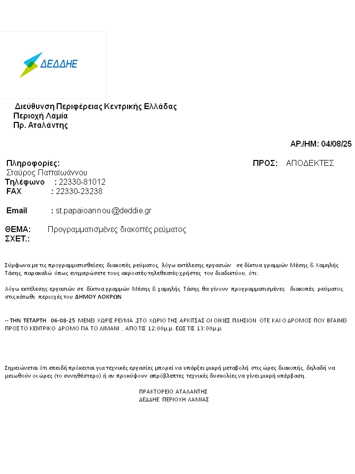 Προγραμματισμένες διακοπές ρεύματος στο Δήμο Λοκρών