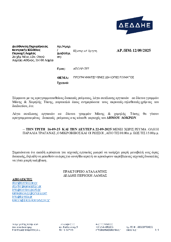 Υποβλήθηκε Πα, 12/09/2025 - 02:19 Προγραμματισμένες διακοπές ρεύματος στο Δήμο Λοκρών