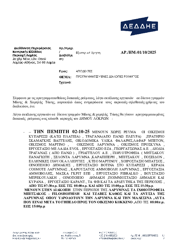 Προγραμματισμένες διακοπές ρεύματος στο Δήμο Λοκρών