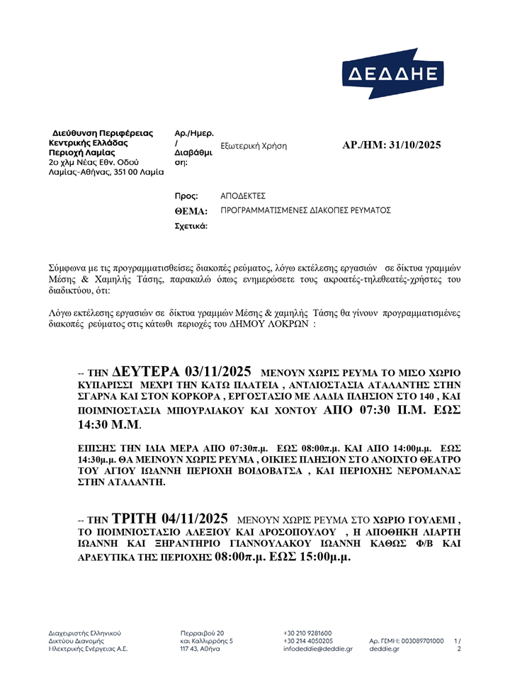 Προγραμματισμένες διακοπές ρεύματος στο Δήμο Λοκρών