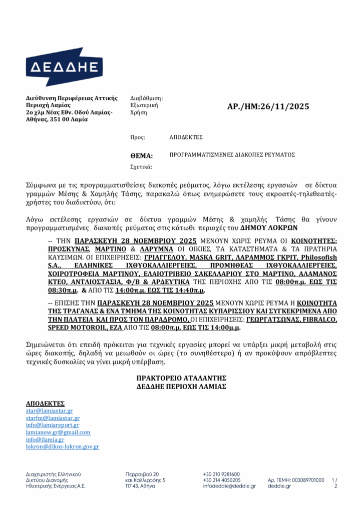 Υποβλήθηκε Τε, 26/11/2025 - 09:53 Προγραμματισμένες διακοπές ρεύματος στο Δήμο Λοκρών