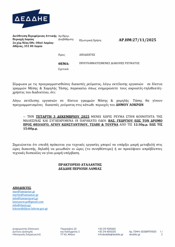Προγραμματισμένες διακοπές ρεύματος στο Δήμο Λοκρών