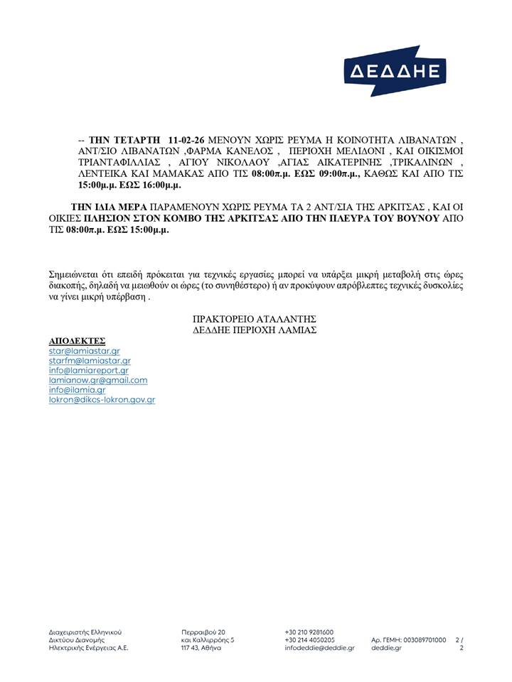 Υποβλήθηκε Πε, 05/02/2026 - 03:00 Προγραμματισμένες διακοπές ρεύματος στο Δήμο Λοκρών